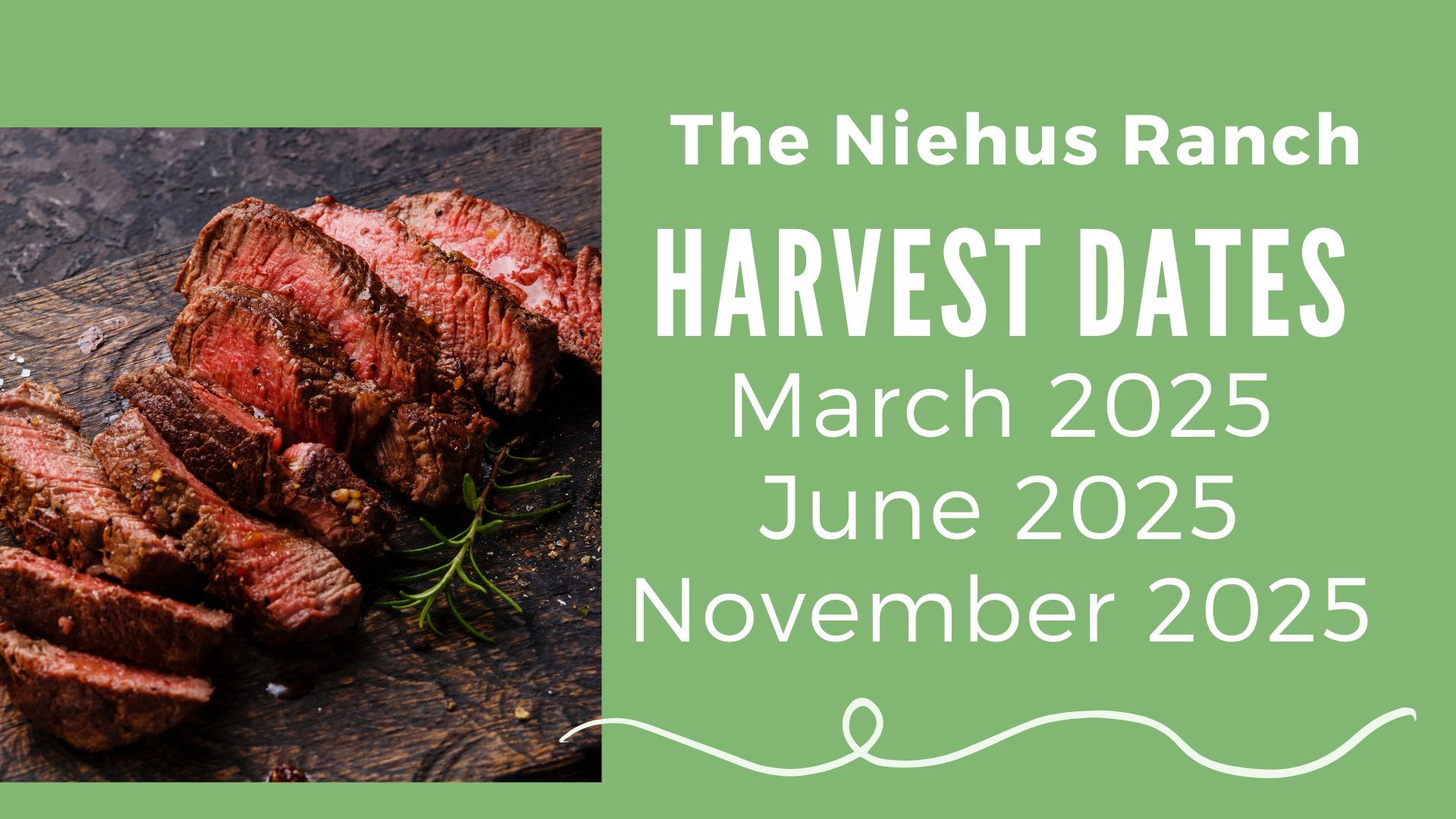 Every animal that is harvested for consumption at The Niehus Ranch is home-raised, insuring that the meat you purchase will be antibiotic free, growth hormone free, and steroid free. Beef can be purchased in 1/4, 1/2 or whole increments.